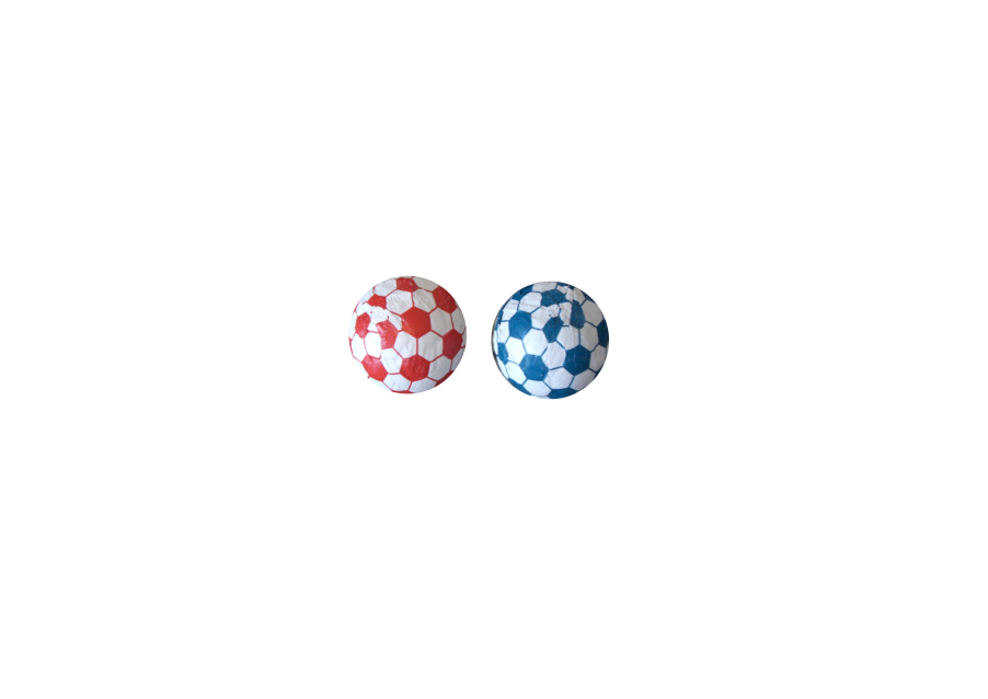 Bolinha de chocolate ao leite embalada em papel alumínio. Disponível em nas cores branco e vermelho e branco e azul – conforme imagem.