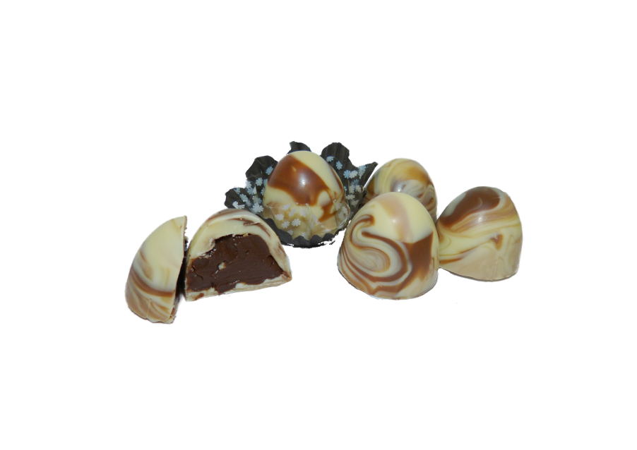 Delicioso doce de chocolate ao leite com chocolate branco recheado com trufa de café.