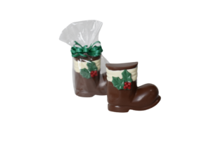 Delicioso chocolate em forma de Bota de Papai Noel ao leite com detalhes em chocolate branco.