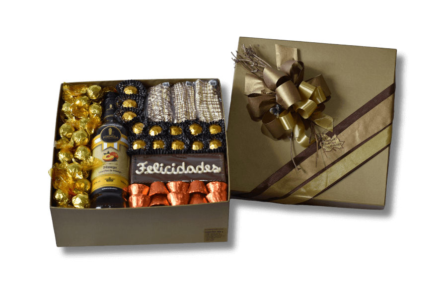 Reunimos em uma caixa com decoração especial: 1 licor de 700ml + 1 barra de 80g (chocolate ao leite com mensagem) + 10 copinhos de chocolate de 10g cada + 3 ramas de 30g cada + 26 bombons de 12g cada. Uma explosão de sabor em uma linda composição!