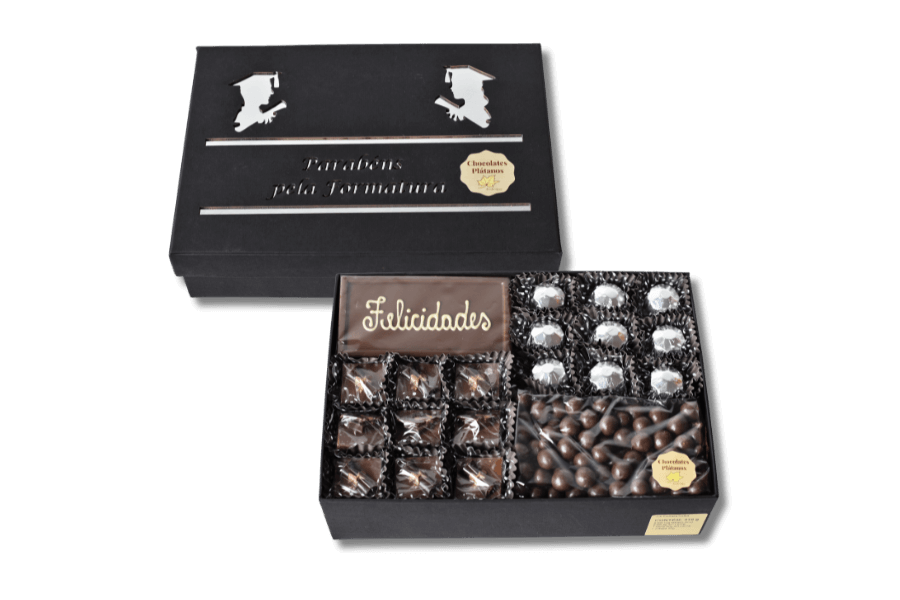 Contém 9 bombons de 12g, 9 bombons de 8g, 1 barra de 40g ao leite e um pacote de 90g de drágeas crocantes ao leite.