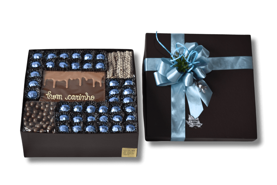 Contém 1 barra de 150g ao leite, 39 bombons de 12g cada, 2 ramas de 30g cada ao leite e 1 pacote de drágeas de 90g.