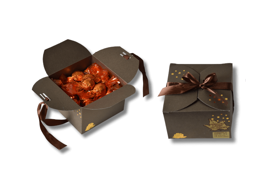 Contém 12 bombons de 12g cada, sendo 6 ao leite e 6 meio amargo. Disponível em duas cores de embalagens, marrom e branco.