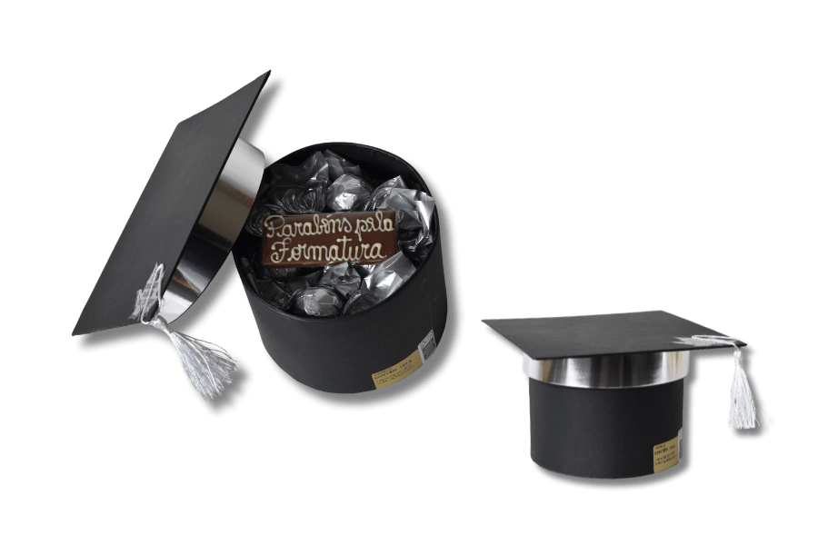 Reunimos em um caixa capelo de formatura, deliciosos bombons e uma barra escrita artesanalmente.