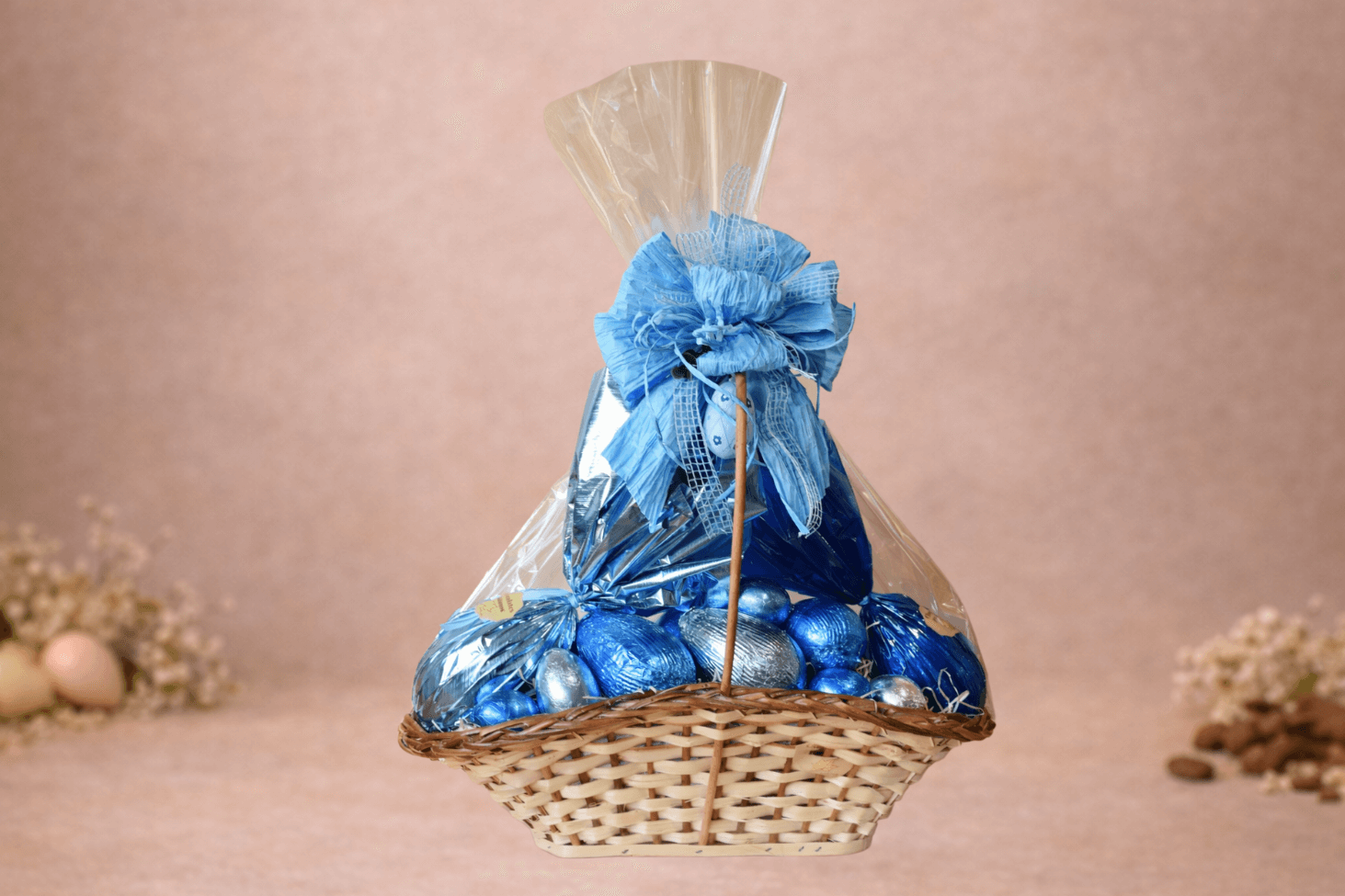 As embalagens combinam entre si, resultando em uma composição elegante e harmoniosa, inspirada nas clássicas cestas de Páscoa à moda antiga.