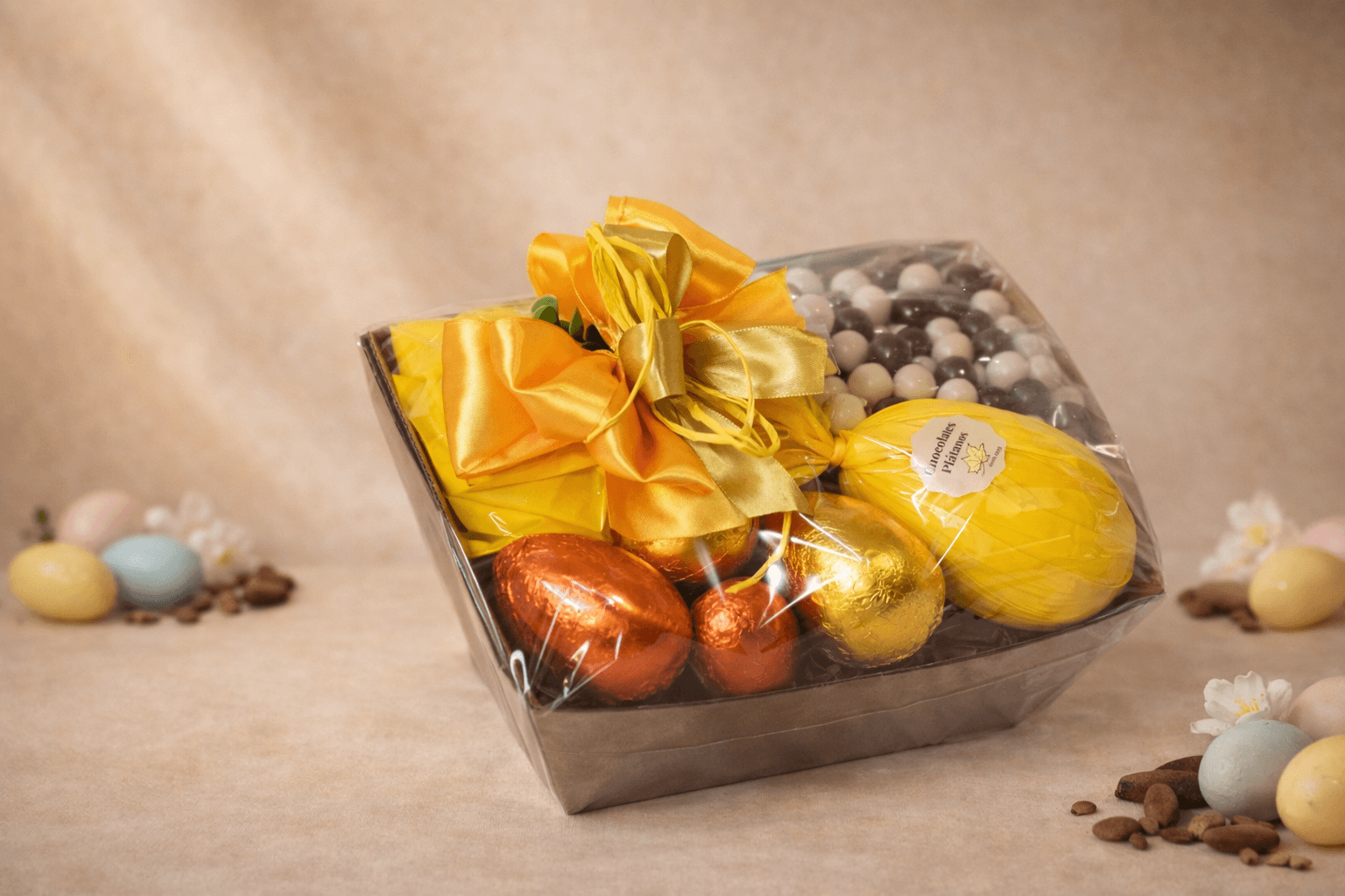 Cesta em kraft com uma composição generosa de chocolates artesanais, pensada para encantar à primeira vista e surpreender no sabor que derrete na boca. Um presente completo, bonito e cheio de cuidado para celebrar a Páscoa com quem você ama.