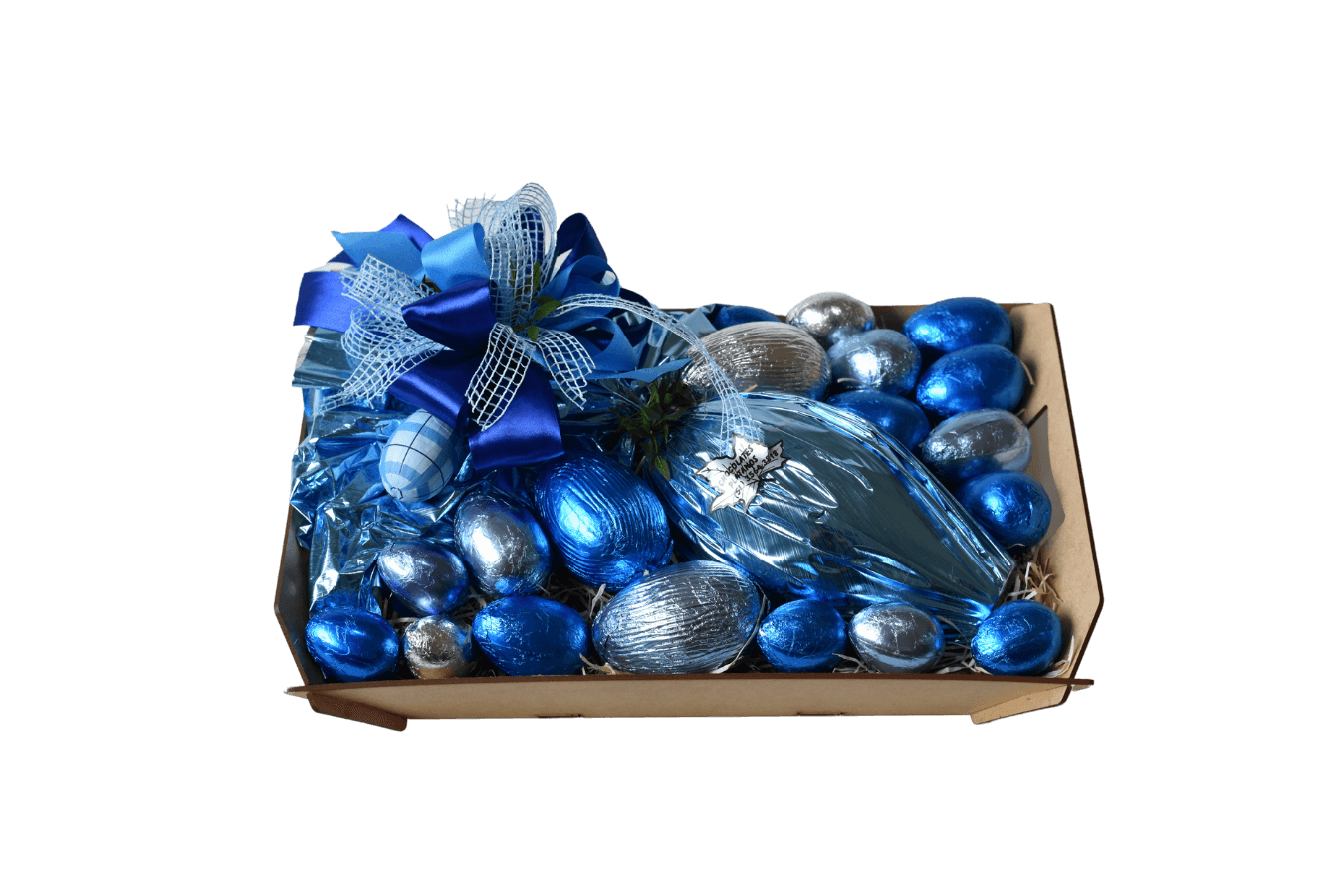 Cesta MDF que contém 1 ovo de 340g, 3 ovos de 50g, 8 ovos de 25g e 9 ovos de 12g. Todos os itens desta cesta são ao leite.