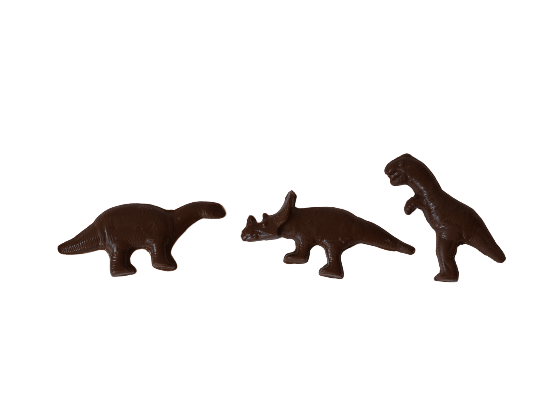 Dinossauros de chocolate ao leite em três formatos diferentes.