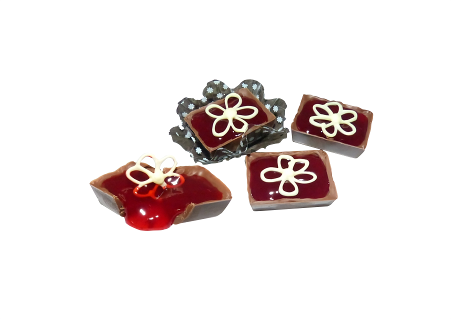 Deliciosa casquinha de chocolate com recheio de gel de morango e decoração especial.