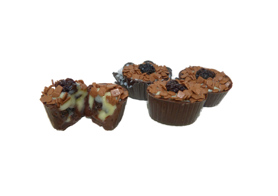 Deliciosa casquinha de chocolate com recheio de trufa e uva passa, podendo ser de chocolate ao leite ou branco