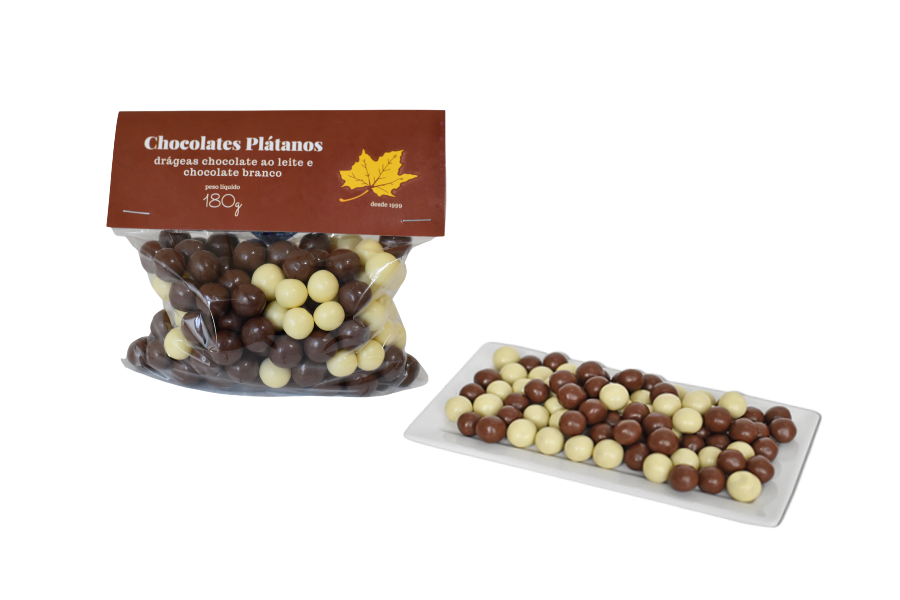 Pacote médio contendo deliciosas drágeas crocantes mistas, cobertas com chocolate ao leite e branco.