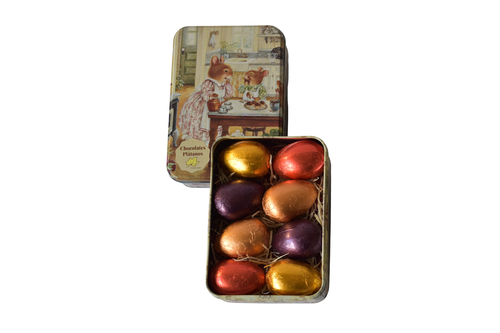 Linda lata com temática de Páscoa com 8 ovos ao leite de 25g.