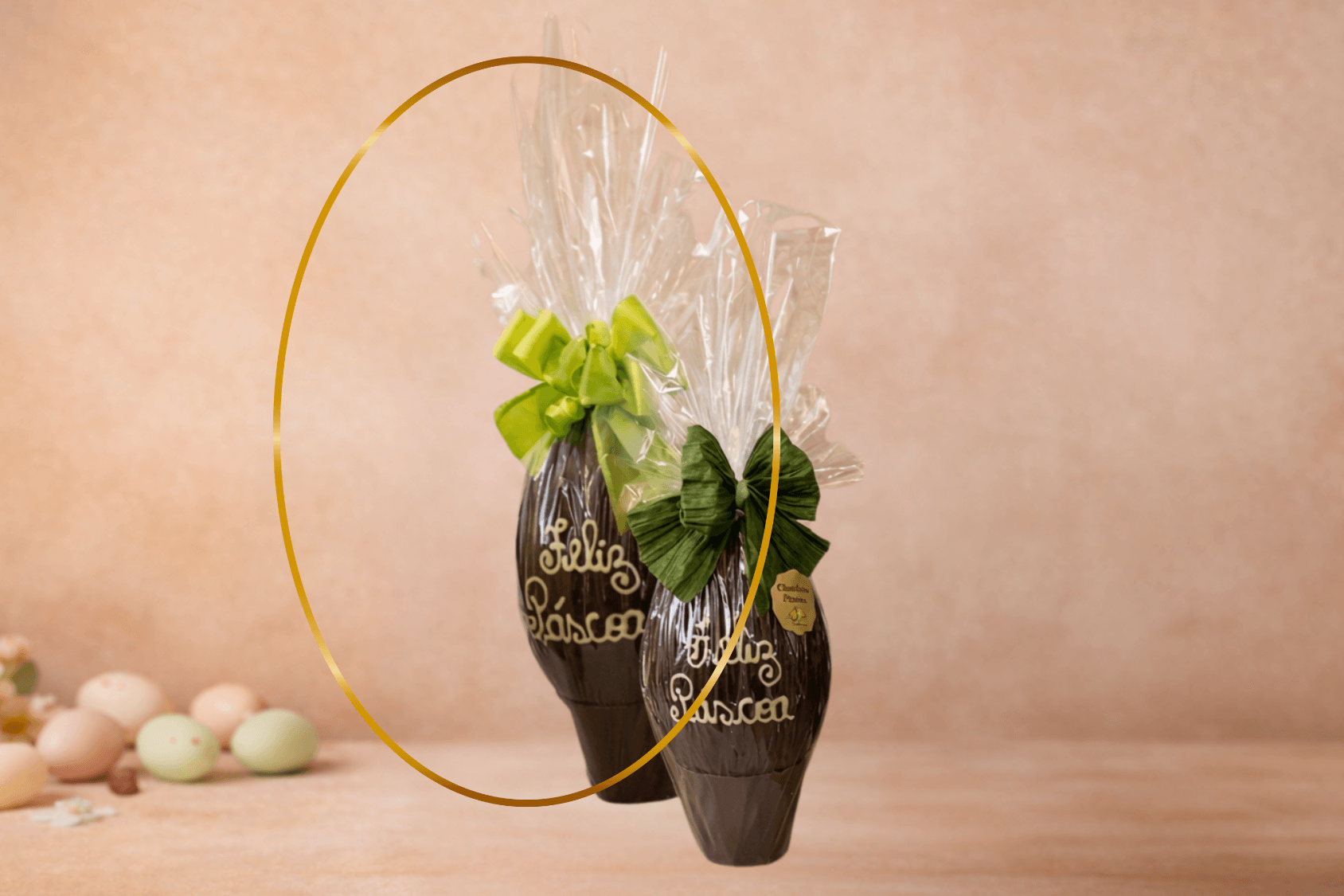 Ovo de chocolate ao leite, moldado artesanalmente e decorado com a mensagem “Feliz Páscoa”, para presentear com delicadeza, beleza e o sabor que derrete na boca. Uma peça elegante, que transforma a celebração em um gesto de carinho e afeto.