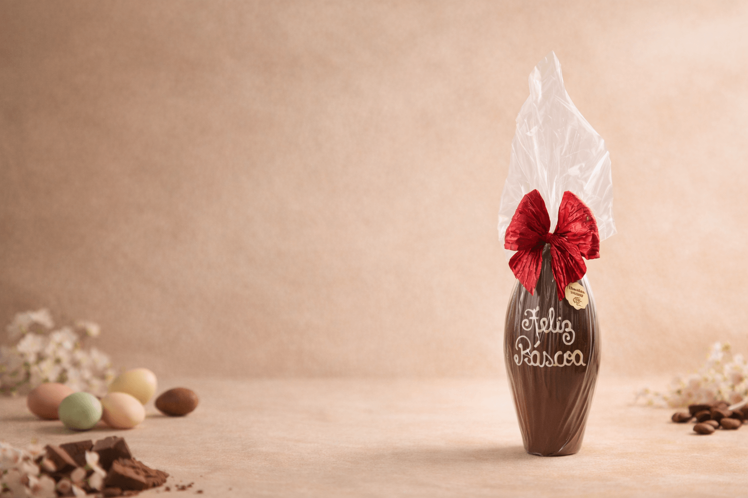 Ovo de chocolate amargo com decoração especial e escrito artesanalmente Feliz Páscoa. Contendo 70,5% de cacau, este produto agrada os mais sofisticados paladares. Nossos produtos em chocolate amargo são todos livres de glúten.
