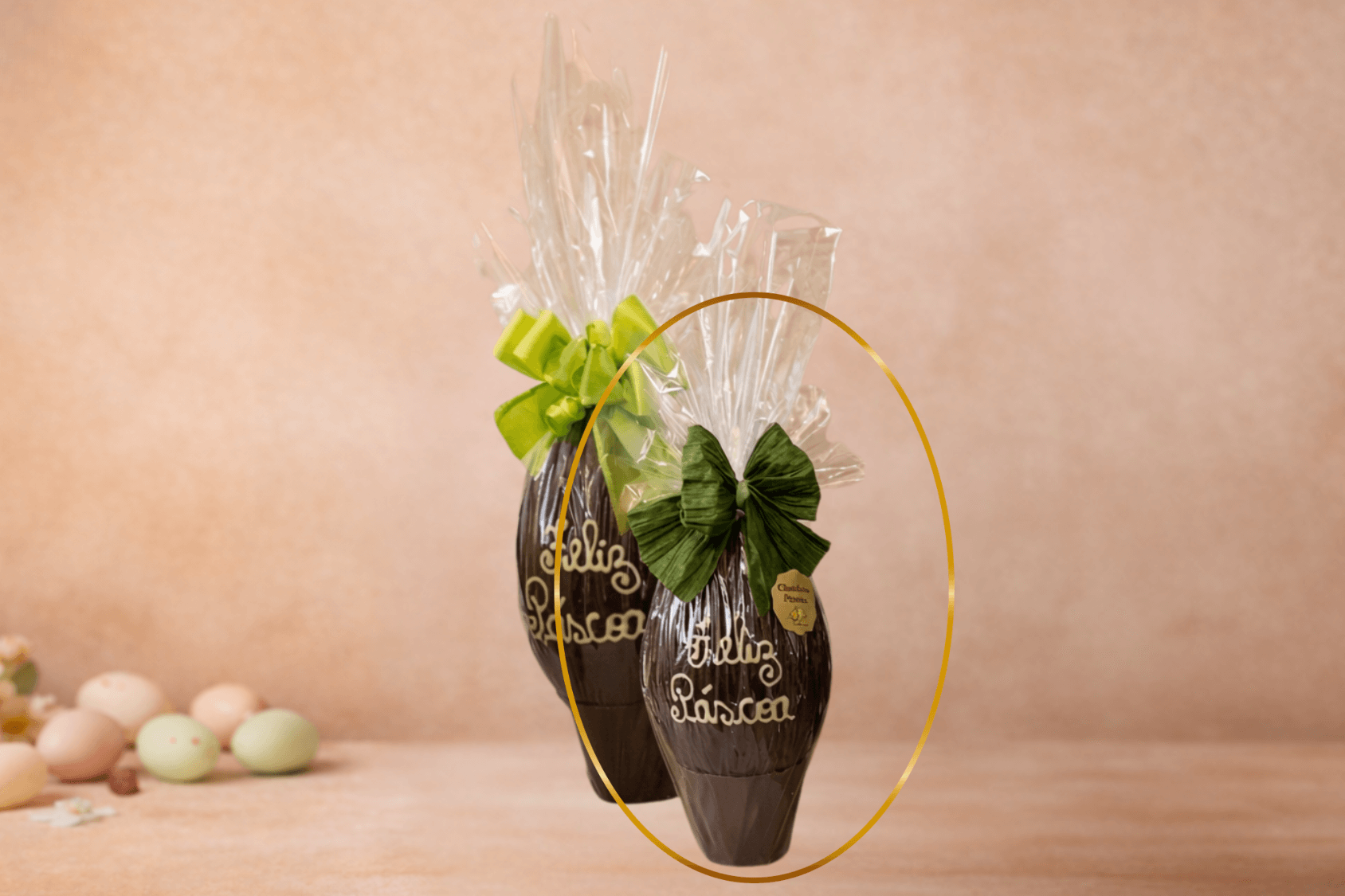 Ovo de chocolate ao leite, moldado artesanalmente e decorado com a mensagem “Feliz Páscoa”, para presentear com delicadeza, beleza e o sabor que derrete na boca. Uma peça elegante, que transforma a celebração em um gesto de carinho e afeto.