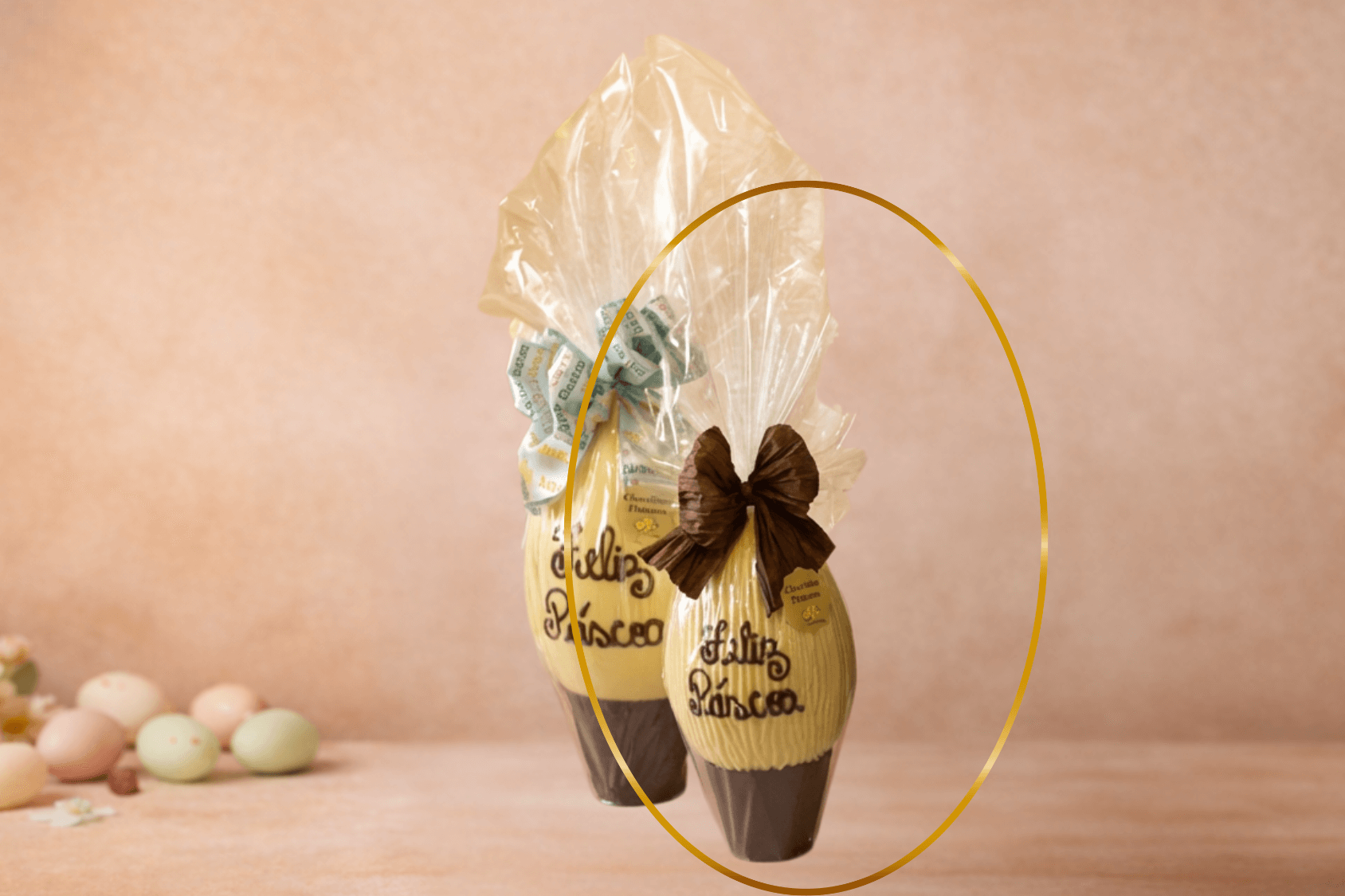 Ovo de chocolate branco, moldado artesanalmente e decorado com a mensagem “Feliz Páscoa”, para presentear com delicadeza, beleza e o sabor que derrete na boca. Uma peça elegante, que transforma a celebração em um gesto de carinho e afeto.