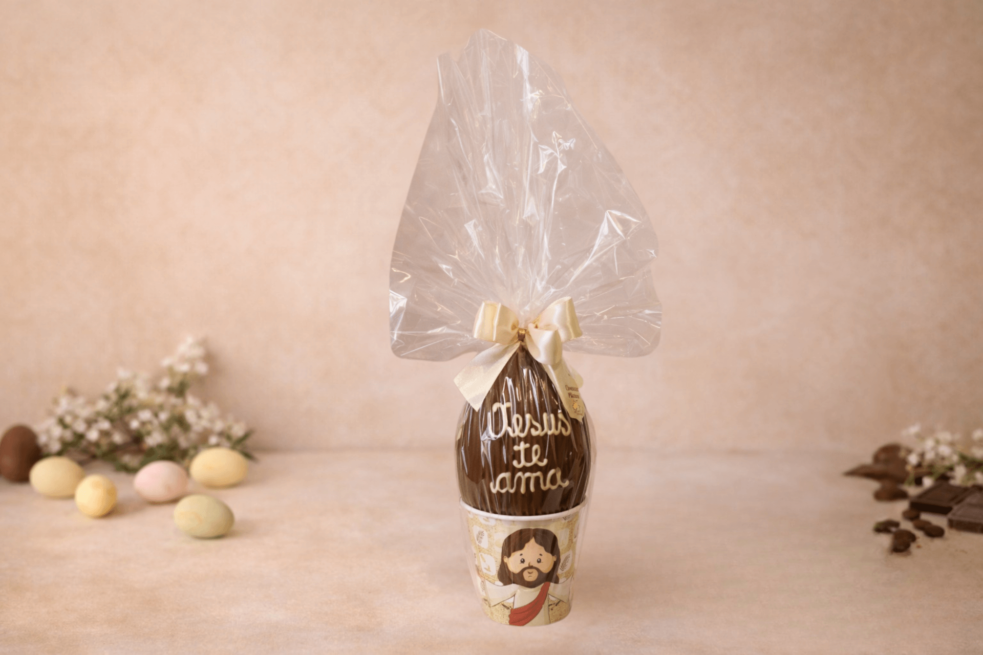 Ovo de chocolate ao leite 110g com a mensagem “Jesus te ama”, moldado artesanalmente para levar um gesto de fé, carinho e doçura à Páscoa. Um presente delicado que une significado, beleza e o sabor que derrete na boca.