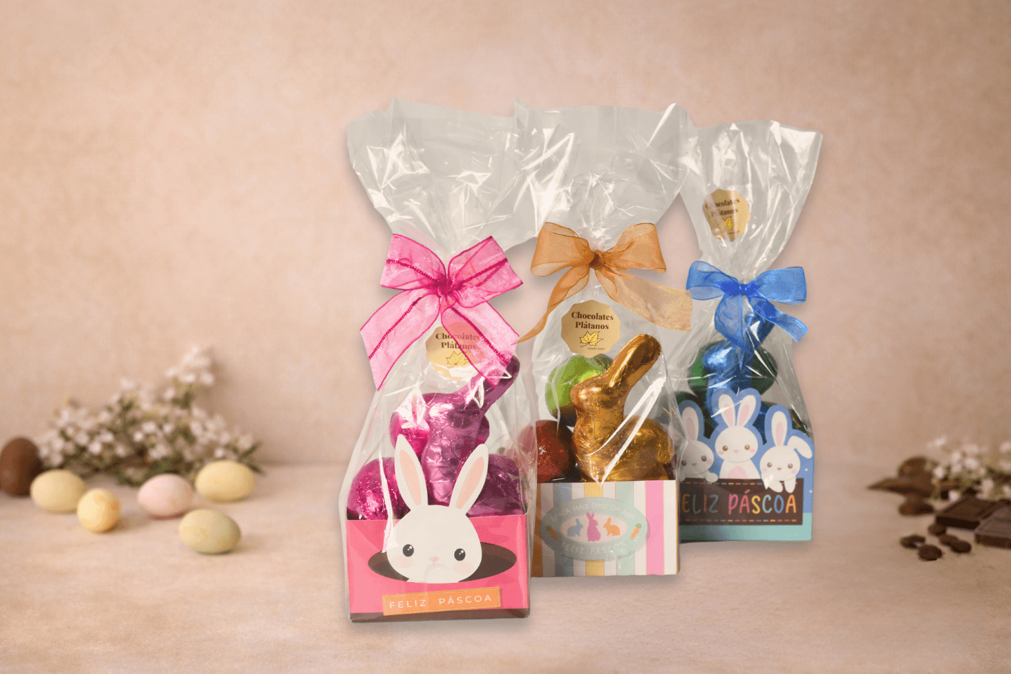Pacotinho de Páscoa com 1 mini coelho 30g e 3 ovinhos de chocolate ao leite de 12g cada, em uma composição delicada, colorida e cheia de charme — perfeito para presentear com carinho e adoçar pequenos momentos nesta Páscoa.