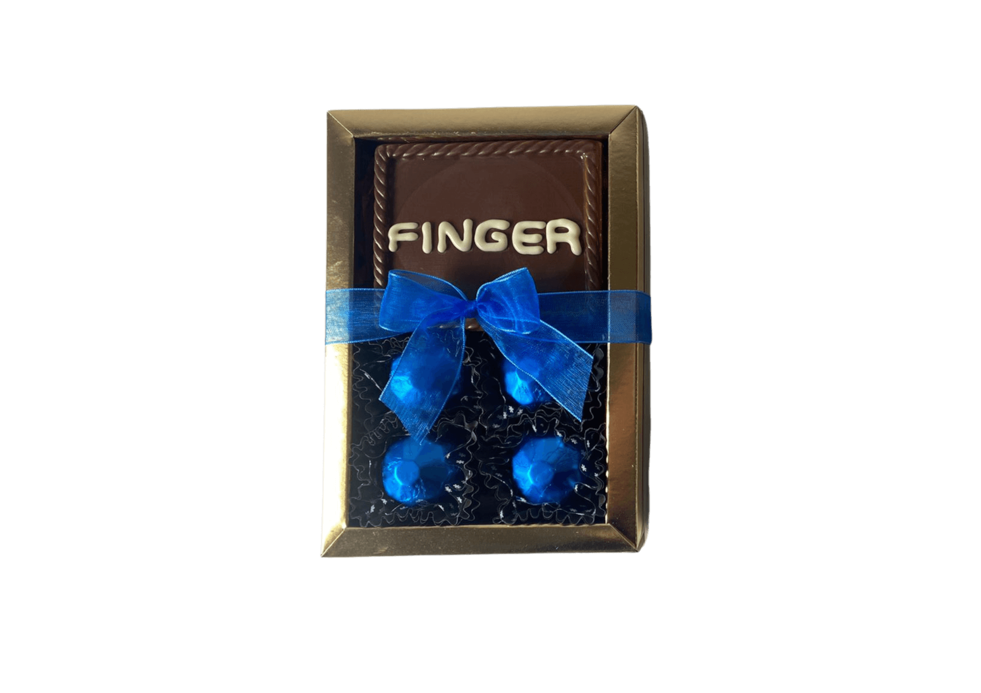 Embalagem com 4 bombons e 1 barra personalizada ao leite.